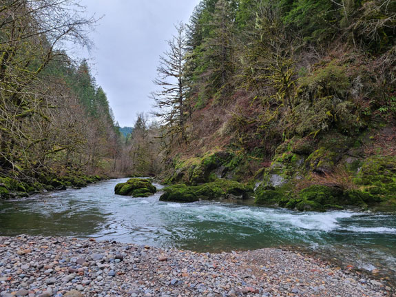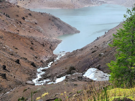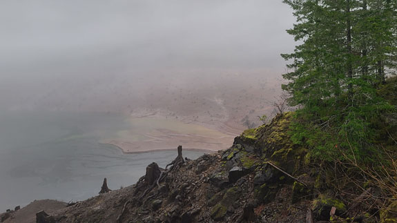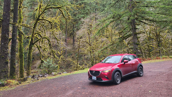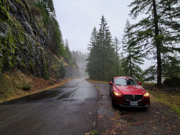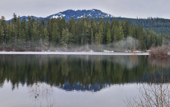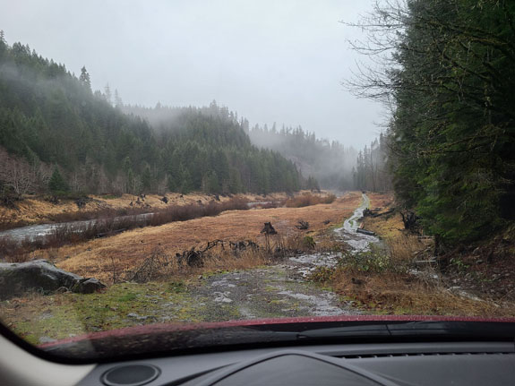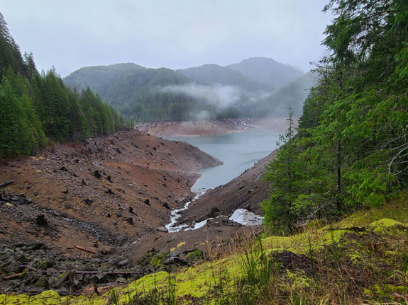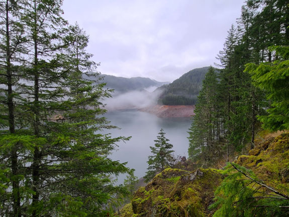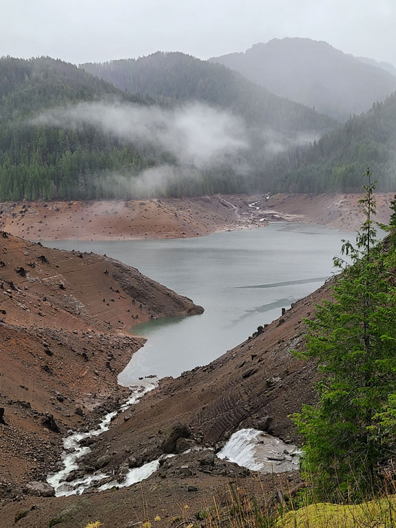 The spring itself is normally manned at the head of the trail and they take the $7 fee while limiting visitors to 15 at a time. There were a few cars in the parking lot but nobody at the booth. I dropped $7 in the slot anyway, to support the place. A short hike through the forest leads to the spring. It has three pools, the hottest and biggest at the top, and two progressively smaller (hot-tub size) and cooler below. There were 6 people in the top pool so I chose the unoccupied second pool instead, finding that if I sit directly under the water flowing down it was warm enough. The other end of the pool not quite so much. Then more people showed up and it started to feel too crowded, so I left. On the way out the upper pool was starting to look like dumpling soup with about a dozen people in it. That loses appeal quickly, but it's the reality of accessible locations like this one. Still, a good experience. The Cougar reservoir has roads going all the way around and I decide to check it out. Soon I see signs saying 'road not maintained for public use' but decide to press on anyway, hoping that the Mazda's AWD and winter tires would get me through.