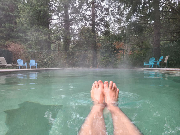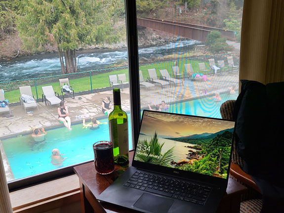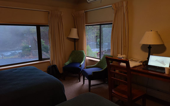 Arriving at the hotel, my room has a view of the McKenzie river rushing by and the hotspring swimming pool (one of two on the property). Some wine, a couple Zone bars, and a soak in the hot mineral pool. Ahhhh.....