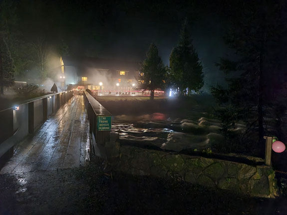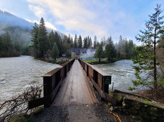 Back at the hotel more soaking in the hot pool, then in the morning a walk around the grounds. There is a main lodge, multiple cabins and RV camping spots. The hot spring source is actually on the other side of the river and is piped to the lodge over the bridge. The bridge is welded from thick steel plate and looks like you could run a locomotive over it.