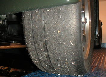 There are a couple of other leaks, too. I guess it's time for a comprehensive going-over of the oiling system. Looks like I lost about 2 quarts during the track day. Good thing the drysump capacity is 7 quarts, so there was still plenty left (about 3 quarts, upon draining the system). Also the reversing box is still disgorging lubricant, if anything worse than before. And none of it seems to be coming from the vent tube that I've added... Hmmm... Good thing I have more than one track car, since next weekend is a two-day prepaid event in California. The Elise gets to go to that one. On the positive side, the new quicker steering rack feels great, the geometry changes are working quite well, and the chassis overall is very confidence-inspiring. Even the brakes work now. With all of that I was able to warm up the tires some... Running 16 psi all around seems about perfect.