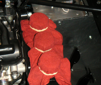 So now I have to procure two new oil pan gaskets from Suzuki dealer, a set of new bolts, a different oil pressure sensor solution, and figure out how to retighten the oil cooler line fittings. And I don't even want to think about the reversing box, which is spraying oil past every seal but none out of the vent tube that I've added. It is safe to say the Westie won't be hitting the road anytime soon. 7/22/02 Got the oil pan back on with the new bolts, and found a much better adapter for the oil pressure sensor. Also redid a lot of the dry sump plumbing connections, correctly this time I hope. With luck it will stay leak-free... And speaking of leaks, after looking at cars at the racetrack, I've implemented a genuine race-car solution for my brake/clutch master cylinders spraying fluid: a high-tech shop rag with equally high tech rubber bands. Doesn't get much more genuine than this.