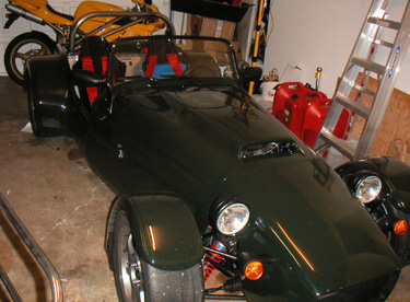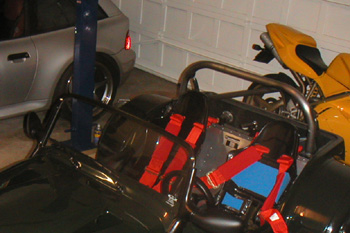 Overall luck is running a bit short it seems. The motor still has a loud clicking noise at idle. Upon some investigation, I determined that Suzuki had a recall on the cam chain tensioner, and it had not been performed on my motor. Of course with it being a salvage engine they are not interested in even releasing the recall kit to the dealer - so I have to figure out which parts I need and order them separately. And of course put them in once they arrive. Perhaps that's all it is, and not a bent valve or anything else equally nasty. Also, finally got the bushings for the wide-track front suspension, so at some point I'll need to install all of that. To date I have spent far more time working on this car than driving it. Wonder if that's going to change anytime soon? So the Westfield is still off the road, waiting for parts and a new rollbar. 7/31/02 Picked up the rollbar that I had someone make for me. The guy came highly recommended, and the work certainly looked nice... BUT - he did not make it to print! I requested 4" radius and tilted legs for the bar, to match the windshield. He instead, for some reason, made the legs straight and the radius more like 12". Which just doesn't look right on the car.