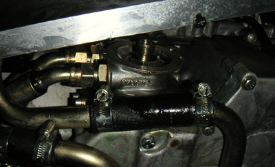 06/09/03 After washing the car (it needed a bath, having antifreeze sprayed all over the place at the last track day) I put it up on the lift and tackled the next issue - removing the oil line restrictor. Basically the restrictor is there to redirect oil flow through stock oil cooler but provide an emergency path should the cooler get clogged. Westfield cooler setup uses a sandwich plate hookup instead of the standard routing - and so all the oil has to go through the restrictor resulting in a massive pressure drop. It's a simple task to remove it - IF you know it needs to be done.