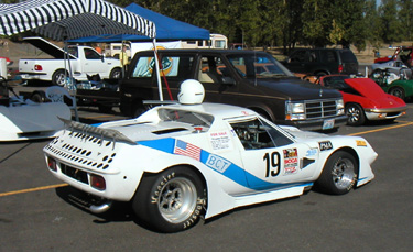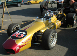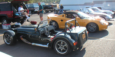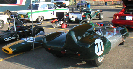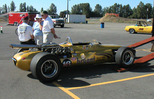 I should have known the car would not like it. In fact I did. And so of course two laps into the first session I come into the chicane and end up sliding all over the place in a cloud of smoke. It took a few more turns to figure out that I was leaking oil like crazy (just in case I stayed off the racing line, which helped just a tad). Then I stopped. It took a good half hour to clean up the oil (and a bill for $56 for the cleanup). After which I got towed back to the pits. Turns out it was just a loose fitting on the oil line connecting the head to the block. Didn't run with any power or RPM in this condition so hopefully the motor is OK. Borrowed tools and a gallon of oil and was able to drive home. Contemplated getting the Elise off the lift but ended up bringing back the Mini instead (see the Mini page). So Westie's track day was over before it really started. Oh well, at least no damage done. The track day itself, coinciding with the west coast Lotus convention, attracted a lot of neat machinery - including a 1965 Indy car.