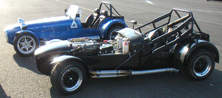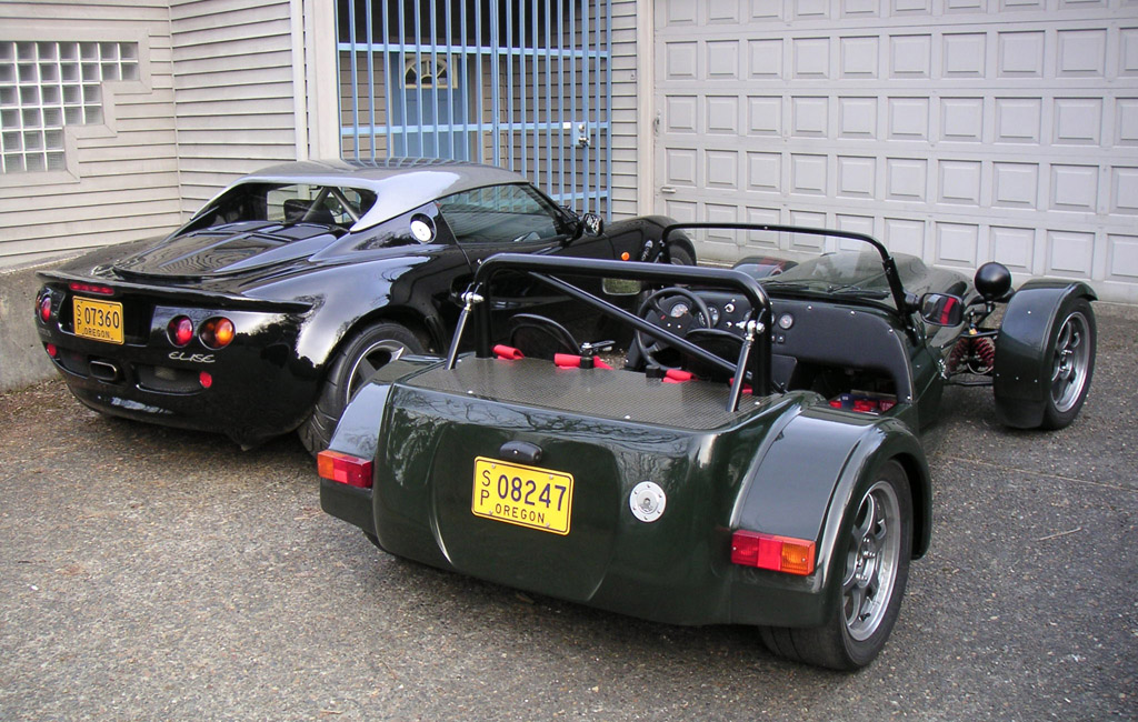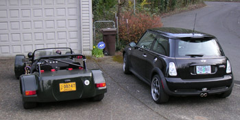 03/11/04 Finally put the C-clips in the dash and went to drive around a bit due to great weather. The Westie certainly is a fun machine, but demanding. Especially in traffic, due to very sensitive clutch. I took it on the freeway for a bit and upon later inspection after it was back up on the lift was gratified to see that there was very little lubricant spillage from the reversing box. Of course the real test would be on the track, but so far so good. Knock on wood. Depending on how it goes Saturday I might actually run it for half a day... In the meantime, couldn't resist taking some pics next to the other two cars in my all-British stable (click on the pic with the Elise for a larger version). Funny part is the Elise and the Westie COMBINED weigh almost exactly the same as the Mini |